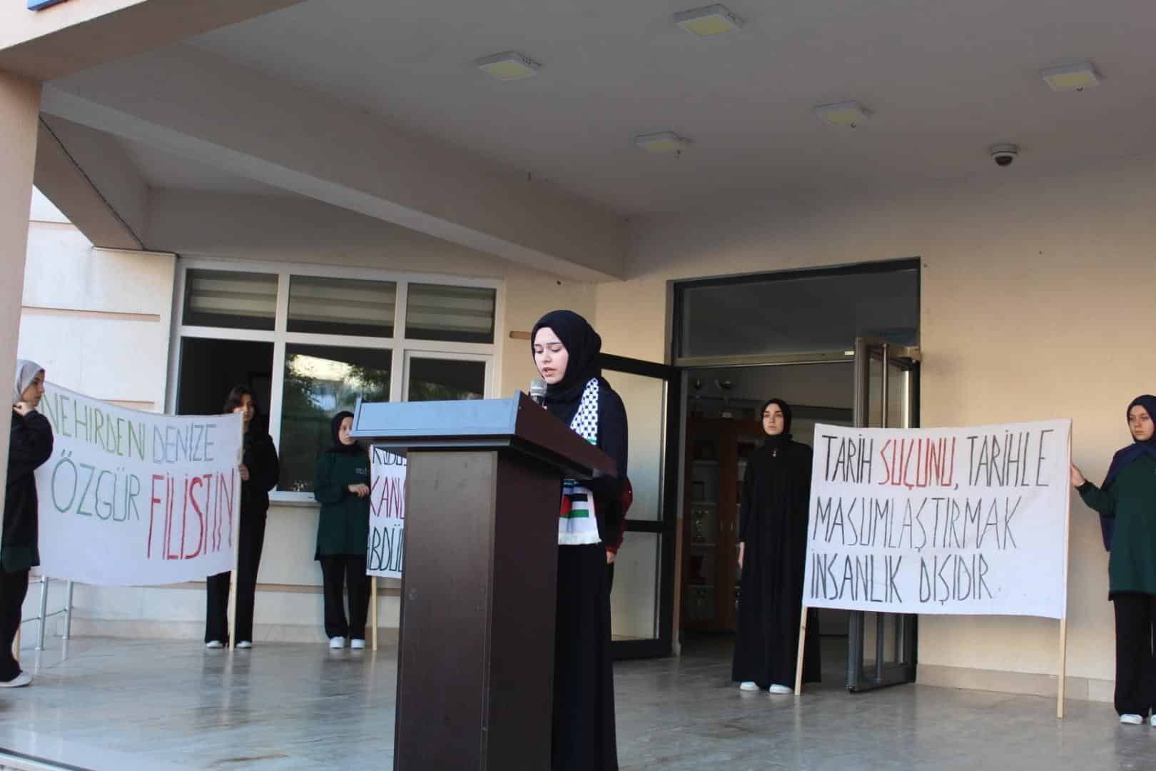 Etkinlikte, öğrenciler tarafından hazırlanan Filistin ve Gazze temalı sunumlar, şiir dinletileri ve kısa gösteriler yer aldı. Programda, Filistin halkının yaşadığı insani dram vurgulanırken, barış, vicdan, adalet ve insanlık değerleri üzerine anlamlı mesajlar verildi.